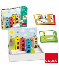 Juego para desarrollar la orientación espacial. 14 piezas de madera, base (reversible), fondo decorado y 45 cartas desafío progresivas. 3 niveles, iniciación, intermedio y avanzado.